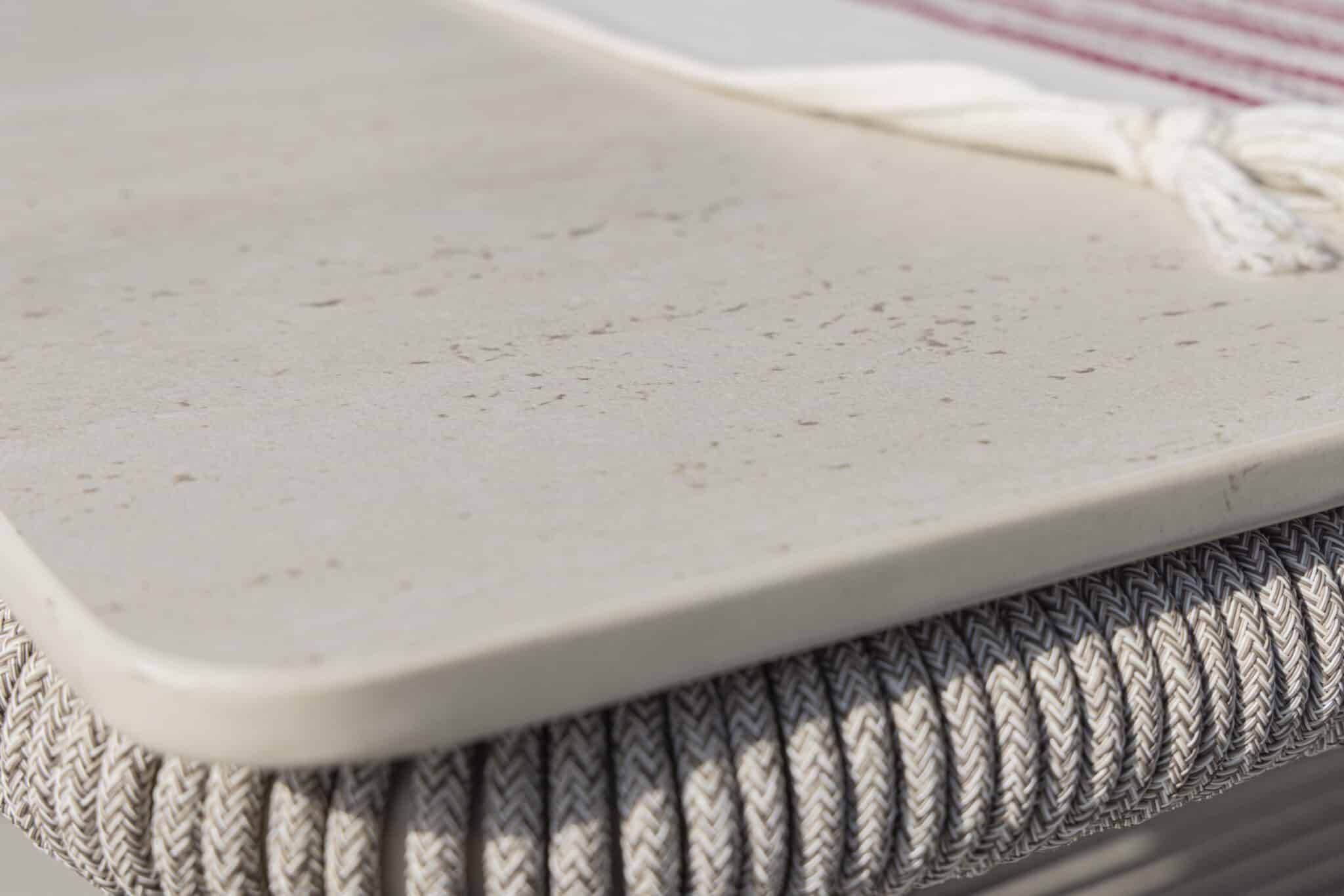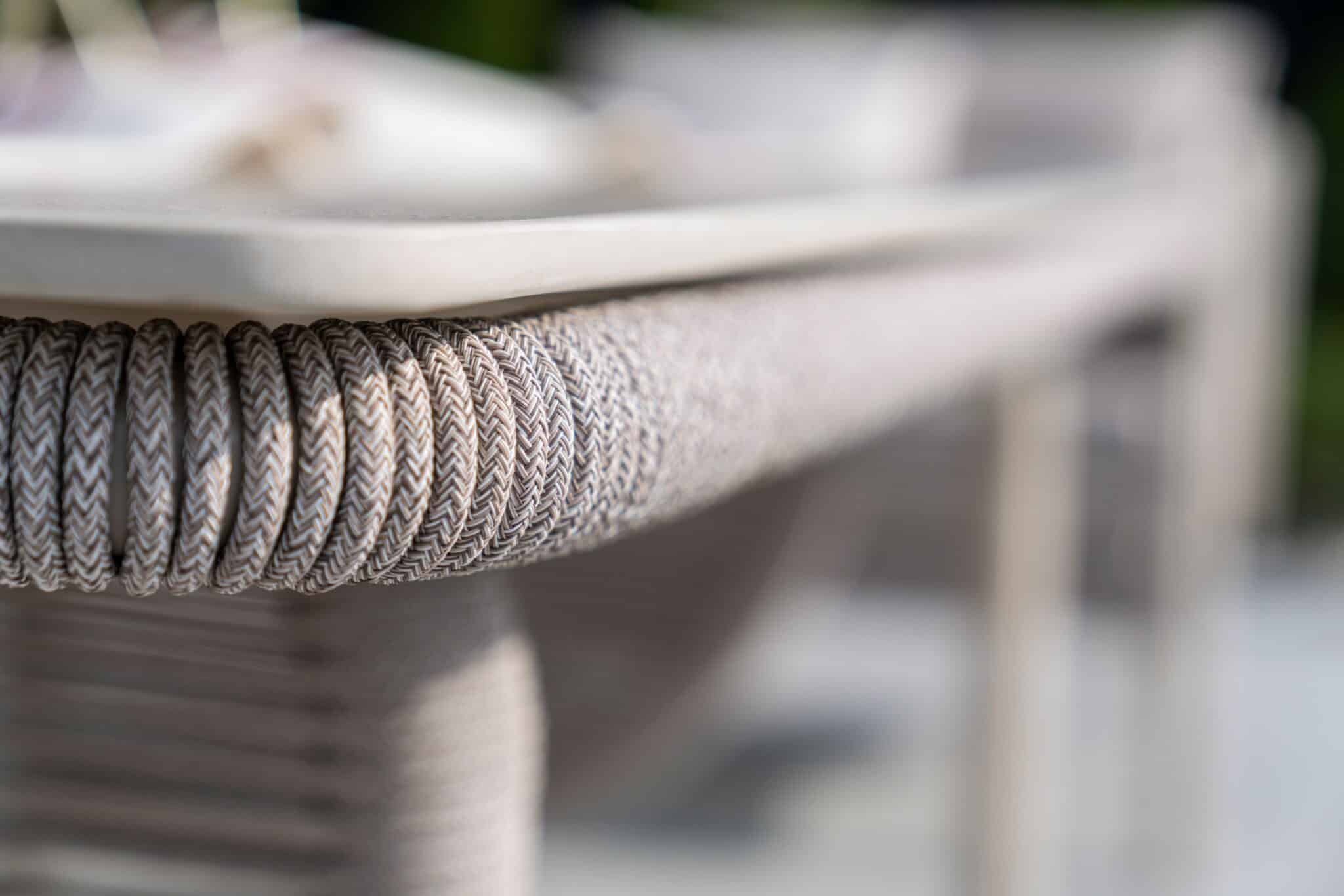 Structura este realizată din aluminiu vopsit în câmp electrostatic , oferind rezistență excelentă condițiilor exterioare și durabile în timp. Masa este prevăzută cu blat din sticlă înfoliată , care adaugă un plus de eleganță și este ușor de întreținut.
