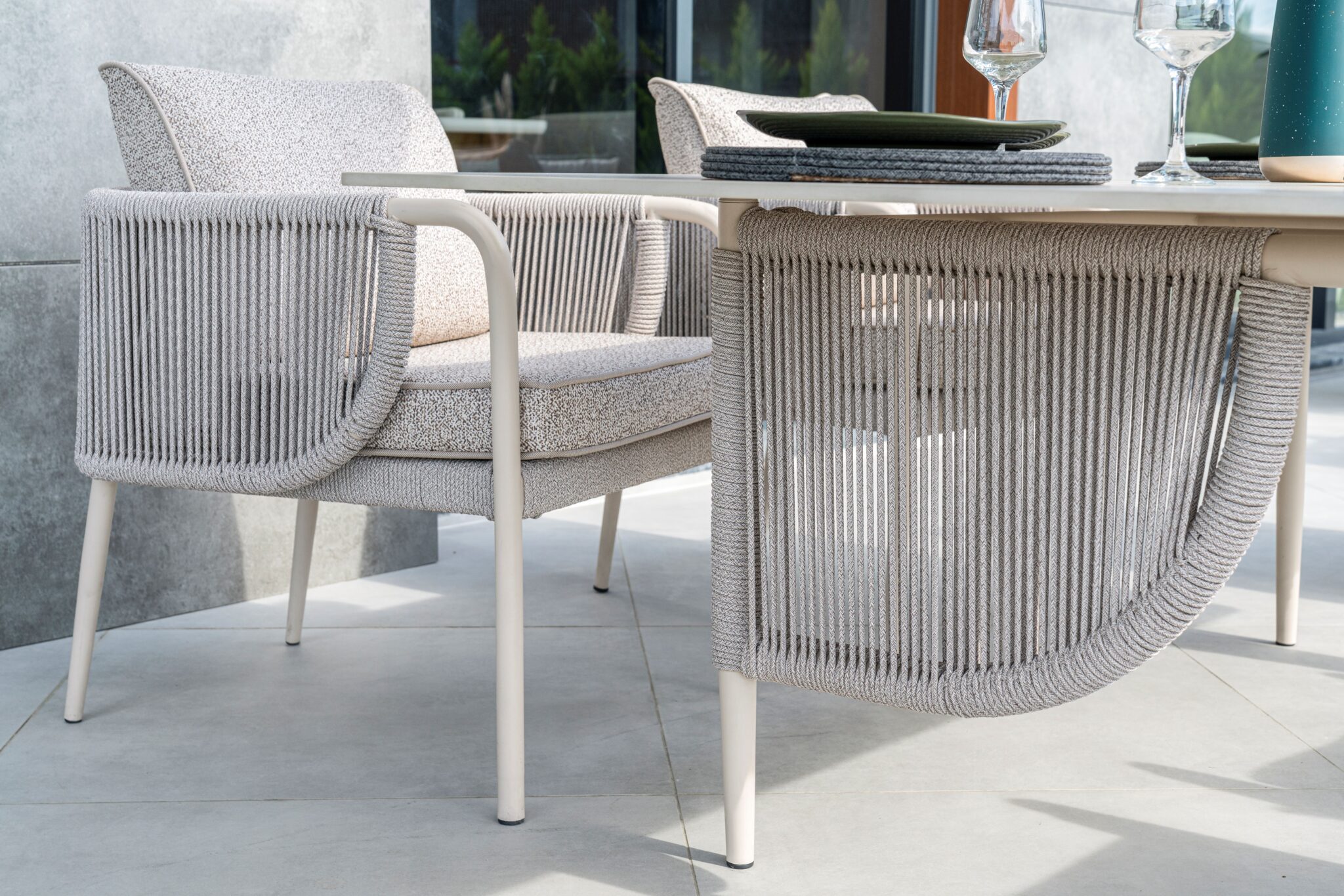 Setul de mobilier pentru terasă Elegance se remarcă prin designul său modern și liniile elegante, fiind ideal pentru amenajarea unui spațiu rafinat de relaxare în grădină, pe terasă sau lângă zonă. Combinația dintre structura metalică și împletitură decorativă creează un aspect contemporan, potrivit pentru amenajări outdoor moderne.