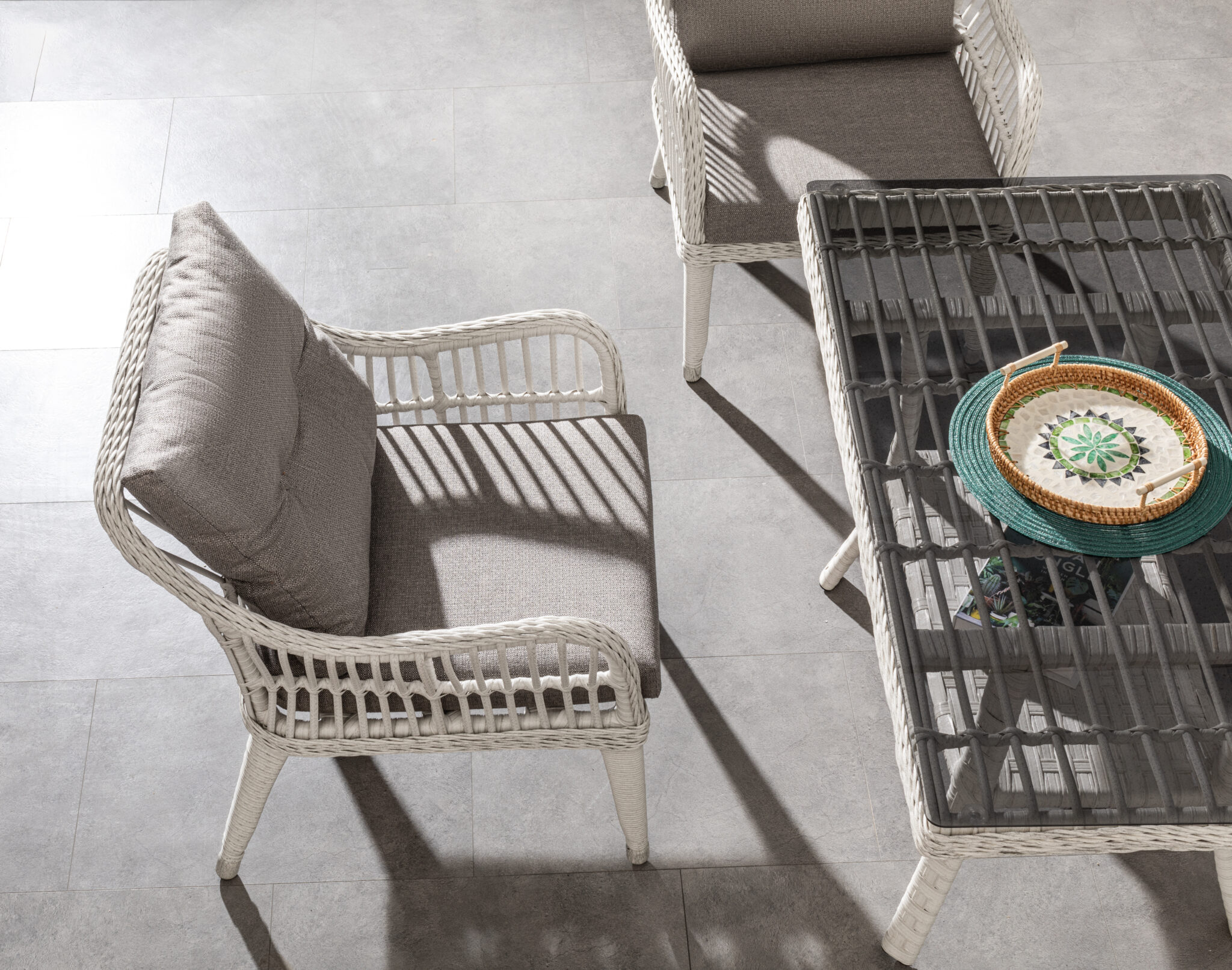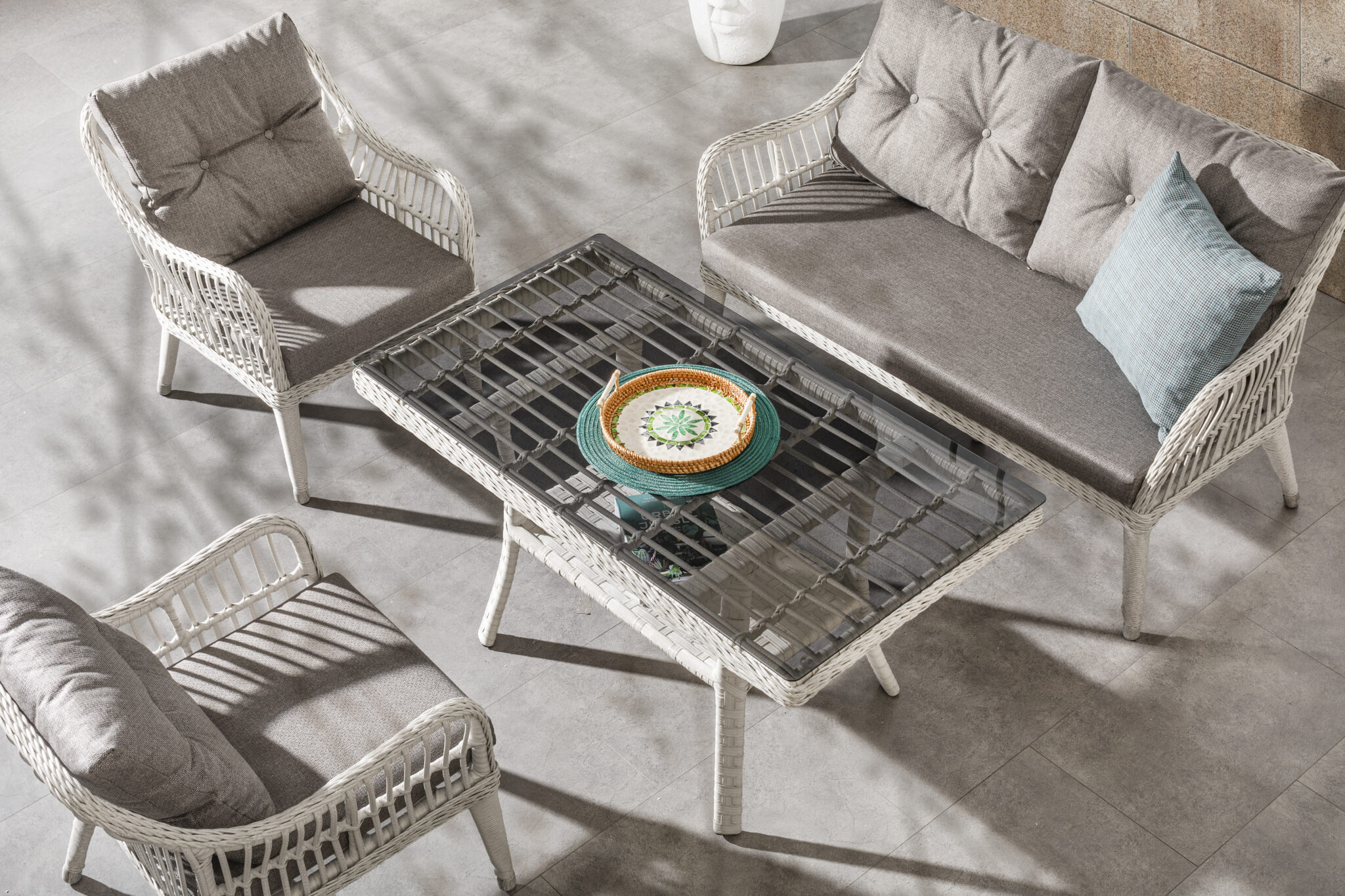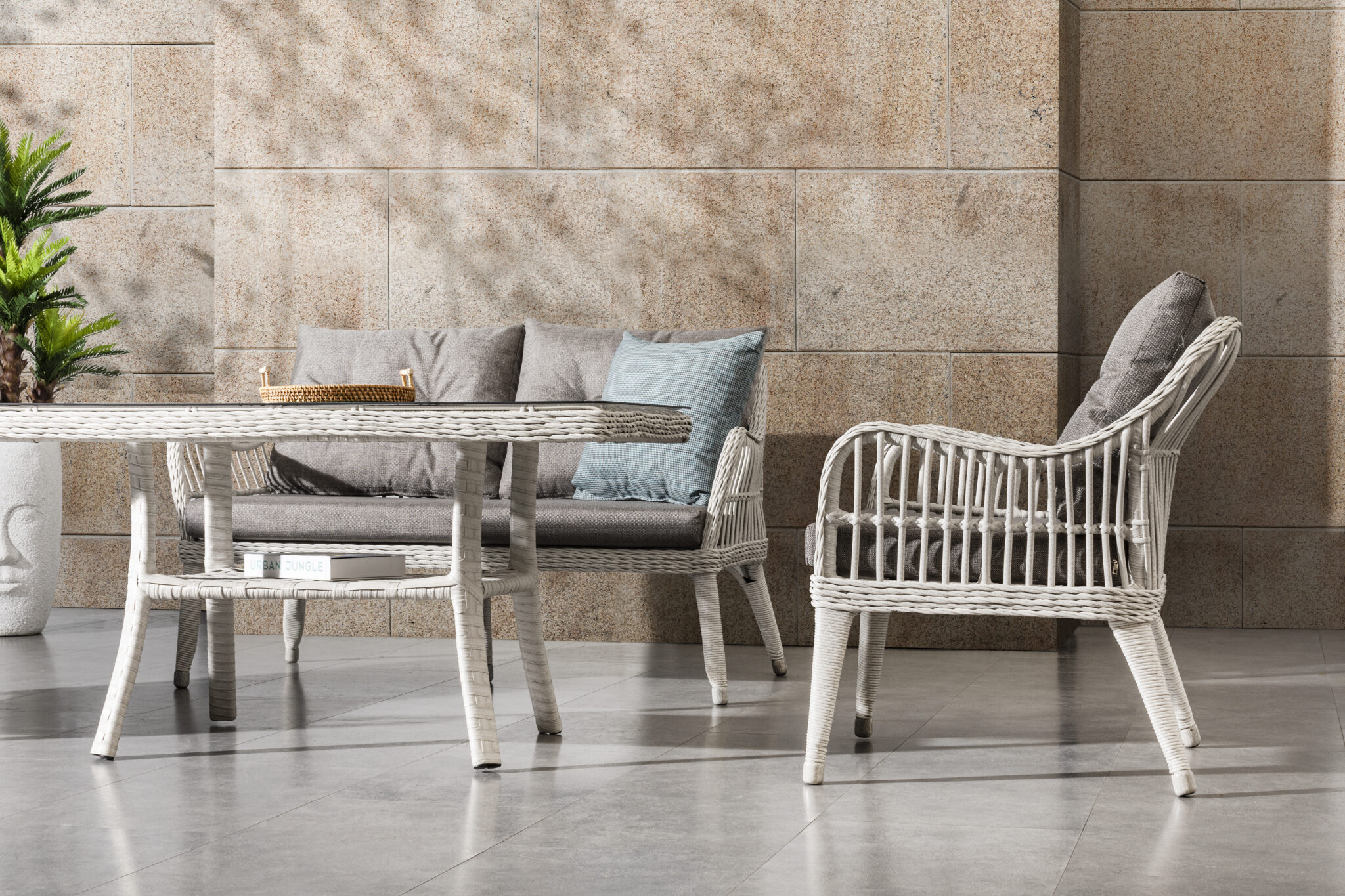 Setul este compus din o canapea, două fotolii și o masă , fiind o alegere ideală pentru amenajarea unui colț relaxant și rafinat în exterior.