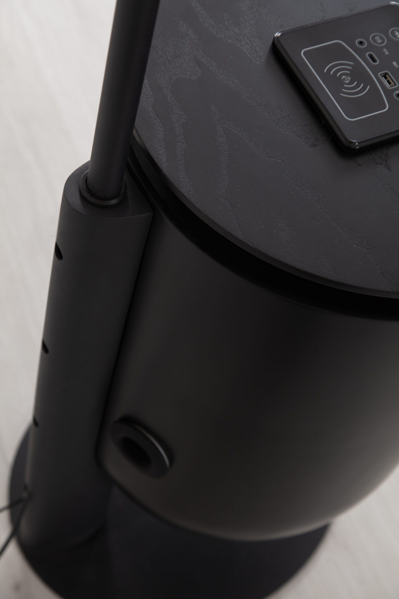 O piesă modernă și versatilă, creată pentru a combina iluminarea decorativă cu funcționalitatea audio. Corpul metalic în finisaj negru mat este îmbinat cu un panou frontal din lemn cu lamele fine, care adaugă căldură și eleganță designului. Boxa integrată oferă calitate bună a sunetului, iar conectivitatea Bluetooth permite redarea muzicii direct de pe telefon sau alte dispozitive.