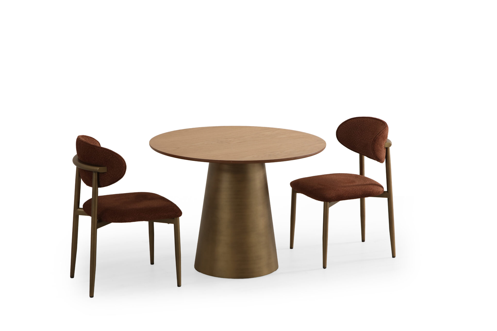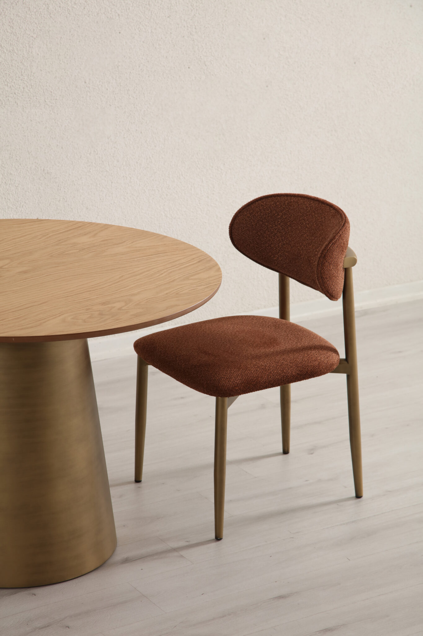 Realizată din MDF de înaltă calitate și bază solidă din metal finisat auriu satinat, masa Kafka aduce un aer cald și sofisticat oricărui spațiu de dining. Forma sa rotundă favorizează conversația și creează o atmosferă intimă și primitoare.