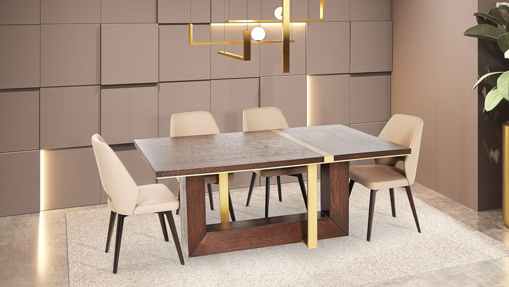 Masa de dining Brunette impresionează prin designul său modern și liniile ferme, fiind realizată din MDF de înaltă calitate cu finisaj elegant. Picioarele sunt fabricate din lemn masiv, oferind rezistență și stabilitate superioară, iar detaliile metalice aurii adaugă un accent sofisticat și luxos.