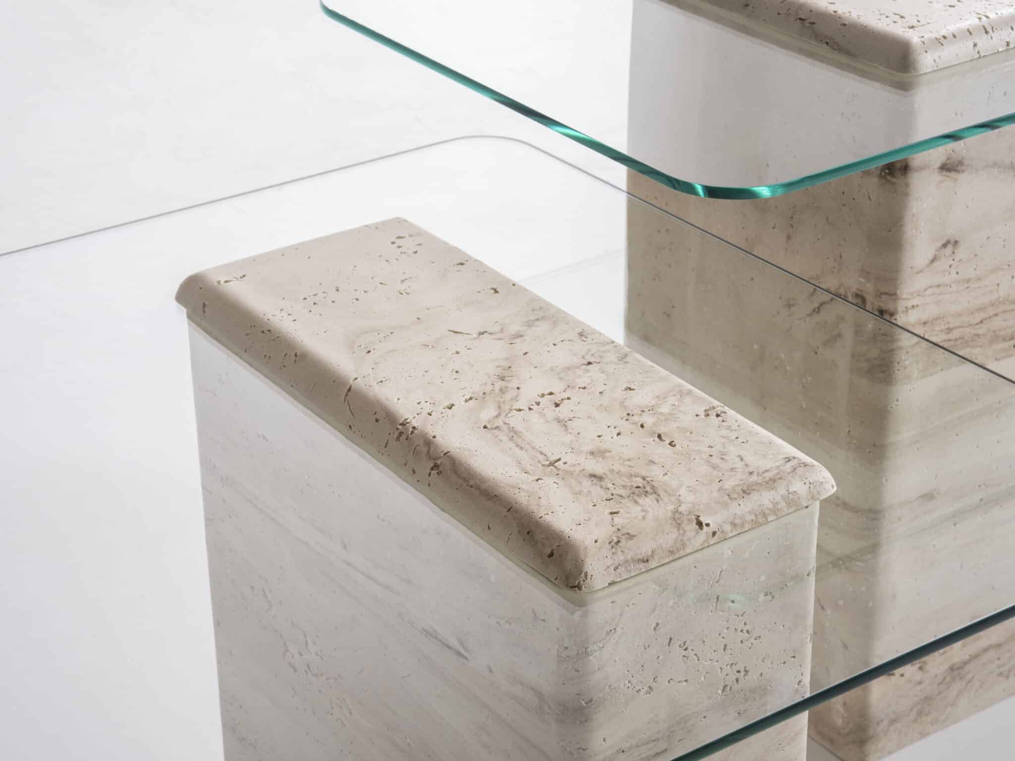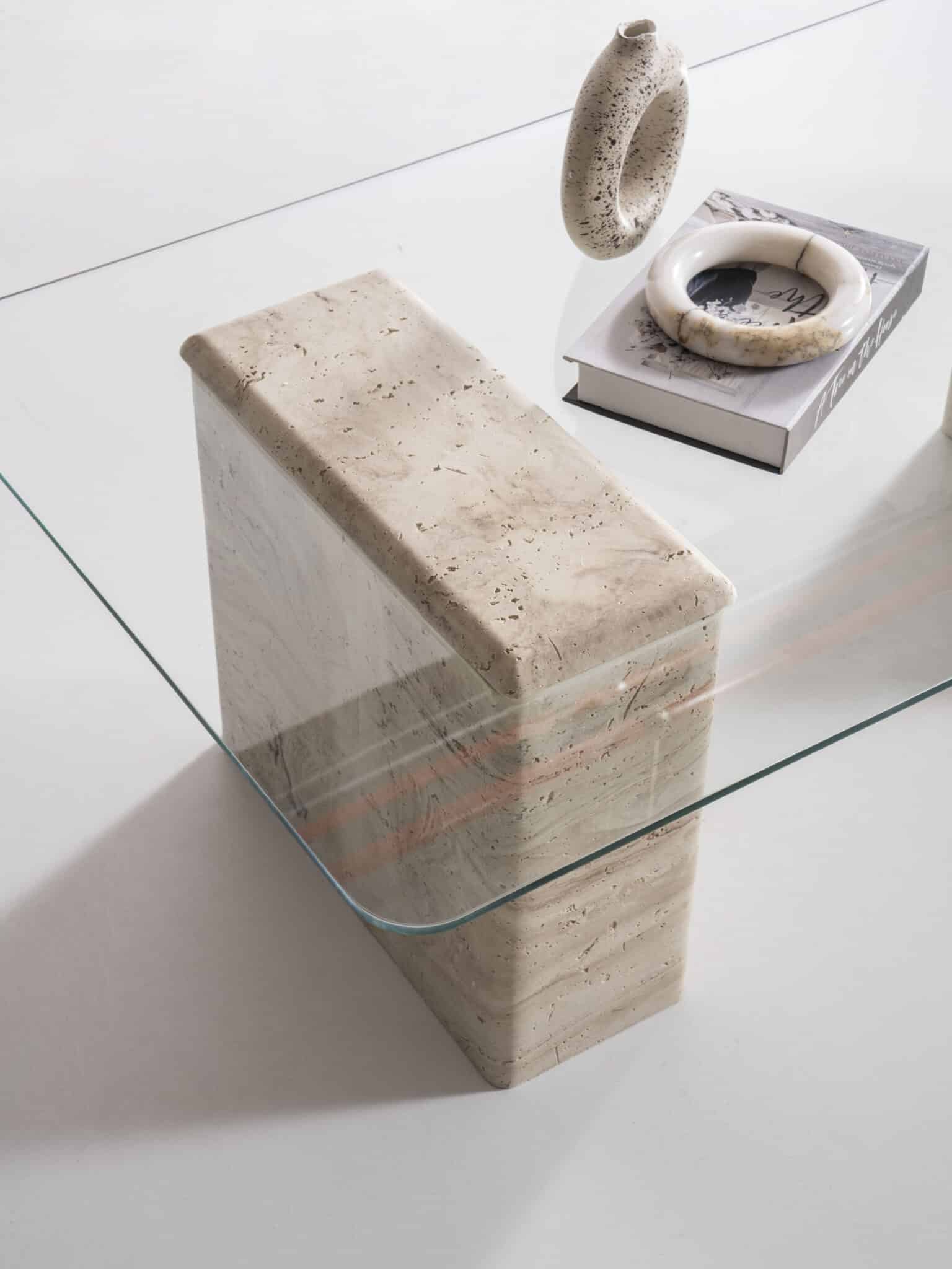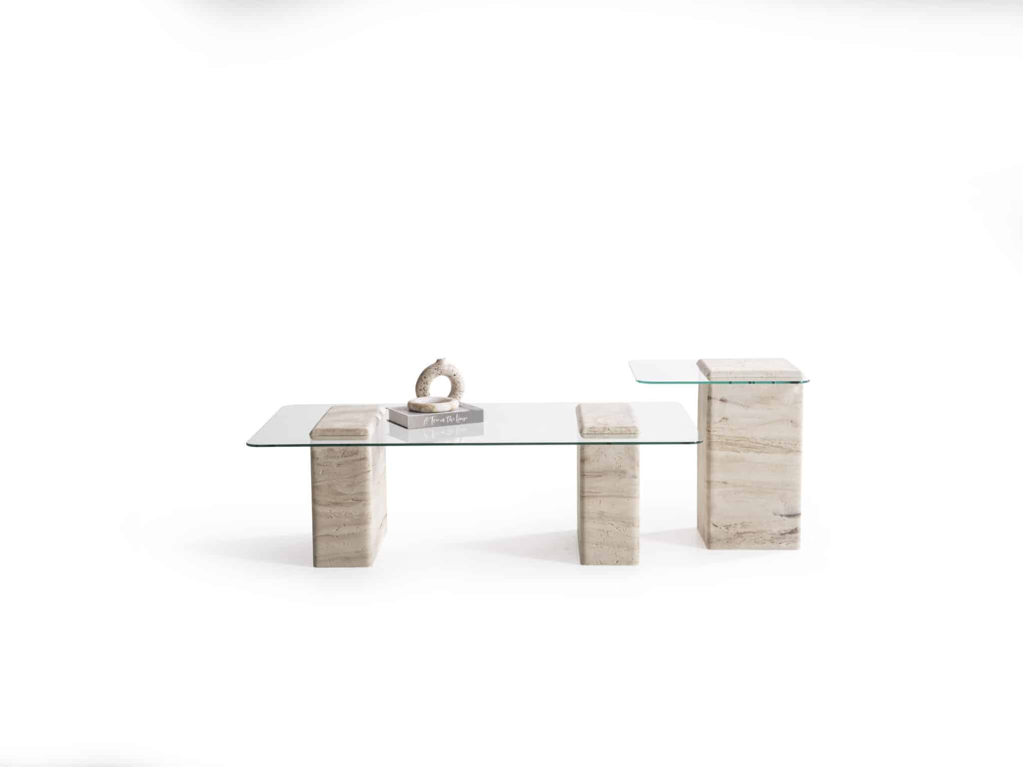 Acest set de măsuțe aduce un plus de stil și funcționalitate oricărui living. Blaturile sunt realizate din sticlă securizată transparentă, oferind un aspect aerisit și modern, în timp ce picioarele din MDF cu finisaj elegant conferă stabilitate și un contrast rafinat. Designul asimetric și combinația dintre materiale premium fac din acest set o piesă centrală, perfectă pentru interioare contemporane și sofisticate.