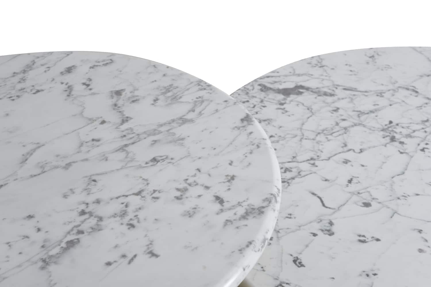 Un dialog subtil între noblețea marmurei și eleganța liniilor contemporane. Acest set de măsuțe impresionează prin blatul realizat din marmură naturală, fiecare piesă păstrând unicitatea desenului mineral, și prin baza cilindrică din MDF finisat cu detalii verticale, ce evocă rafinament arhitectural.