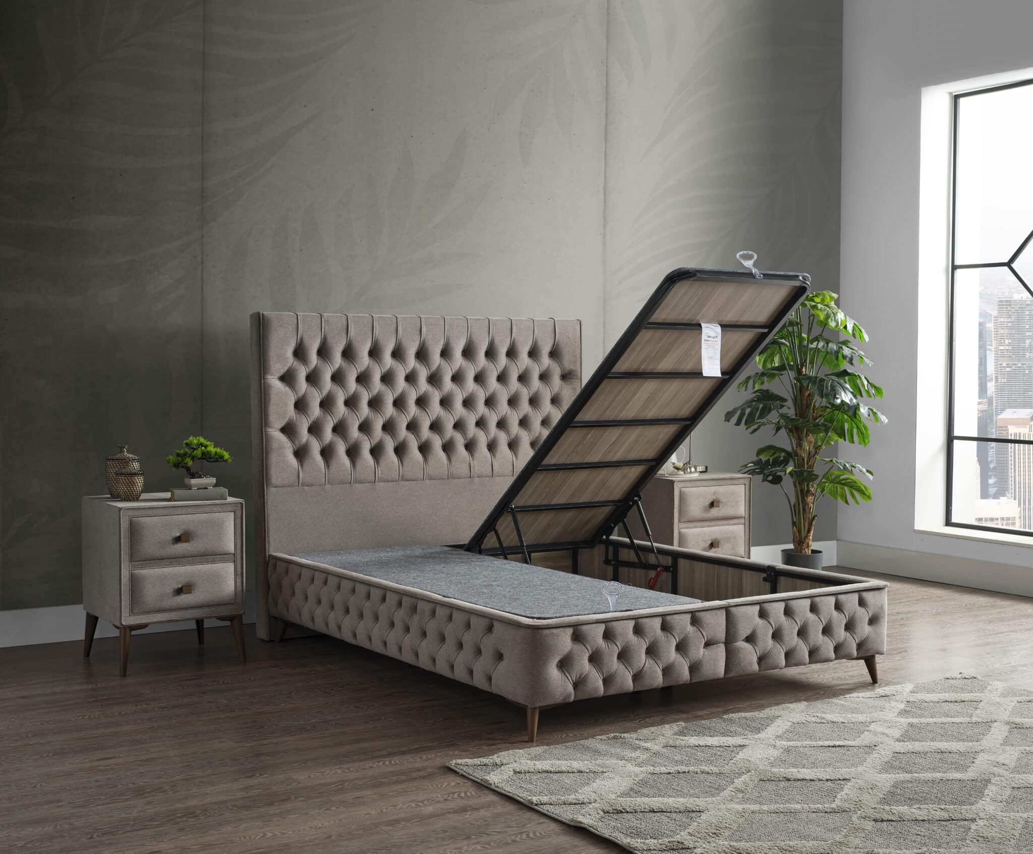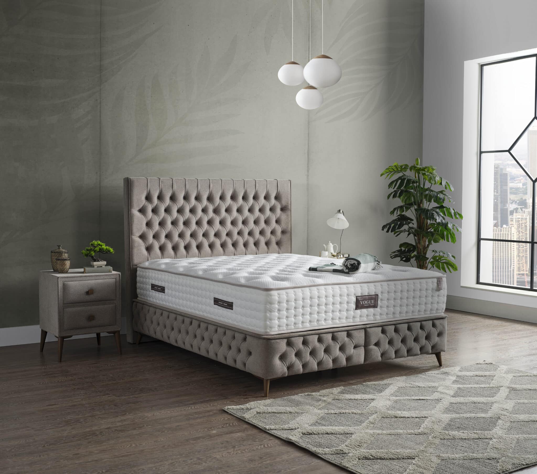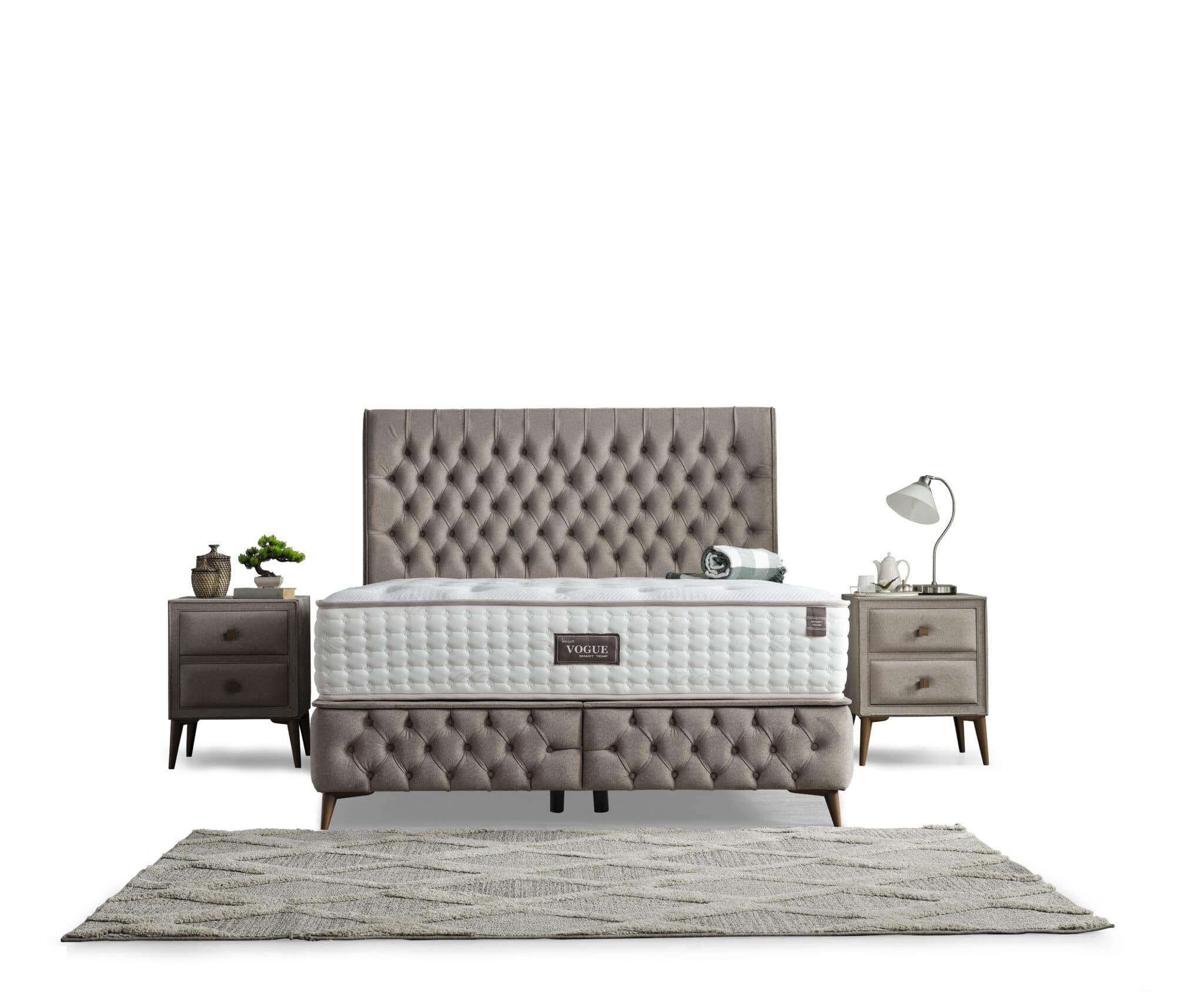 Patul Vogue Smart îmbină rafinamentul designului clasic capitonat cu funcționalitatea practică a spațiului de depozitare inteligent. Realizat dintr-o combinație de MDF, lemn și metal de înaltă calitate, acest pat impresionează prin durabilitate și eleganță atemporală.