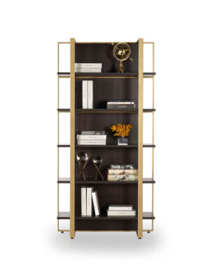Raftul Cruze este o piesă de mobilier modernă, cu un design elegant și rafinat, ideală pentru a aduce un plus de stil și funcționalitate în living, birou sau spații comerciale. Structura sa geometrică, realizată din metal cu finisaj auriu satinat, oferă un cadru stabil și sofisticat, în timp ce polițele din MDF negru mat adaugă contrast și profunzime vizuală.