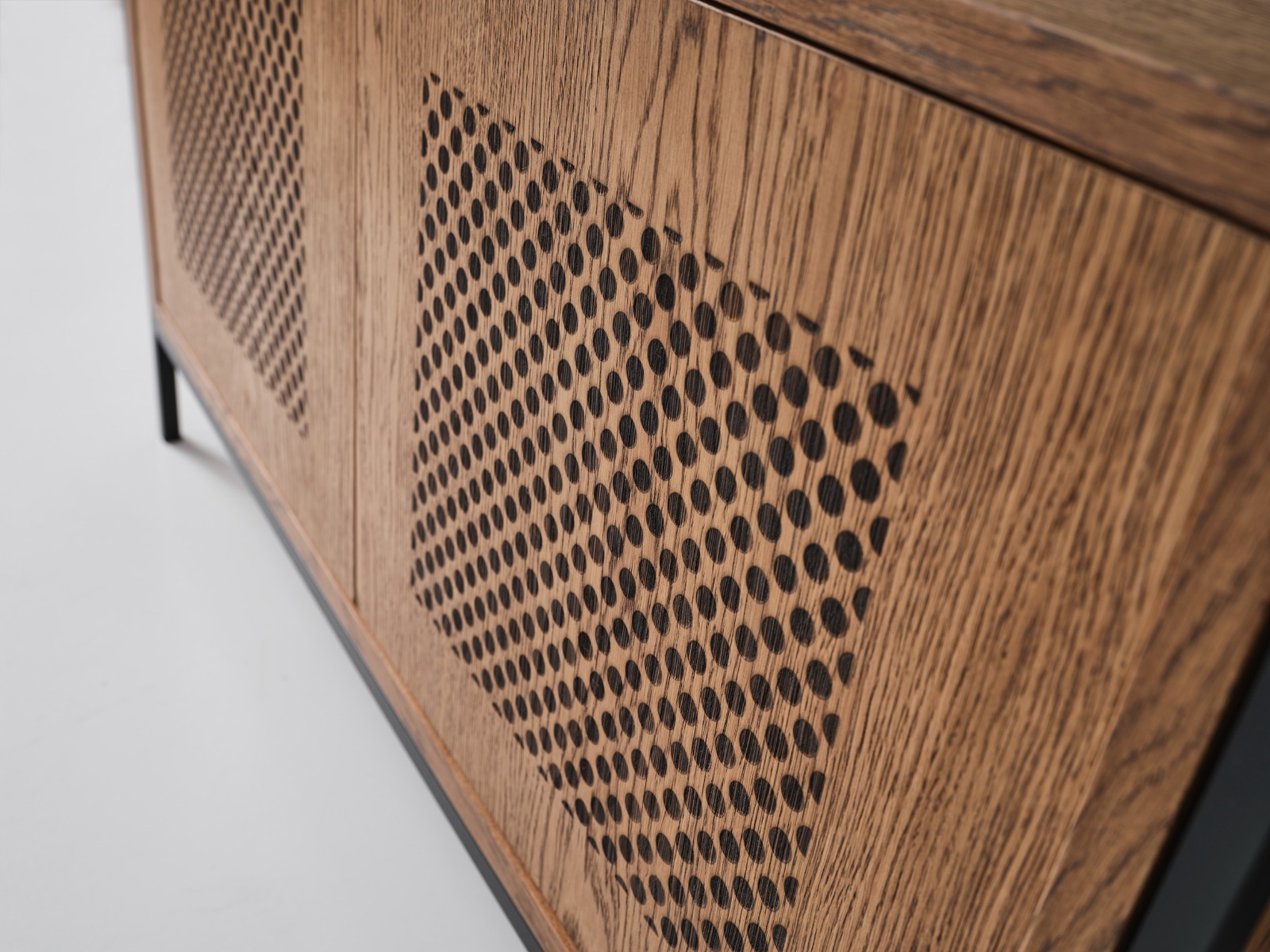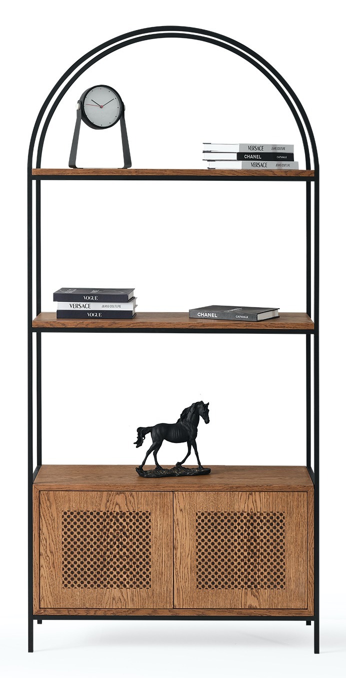 Structura metalică subțire, de culoare neagră, oferă stabilitate și un aer industrial rafinat, iar rafturile și compartimentul inferior din MDF finisat în nuanță naturală de lemn adaugă căldură și echilibru vizual. Designul cu arc superior și fronturile perforate aduc un plus de stil și originalitate.