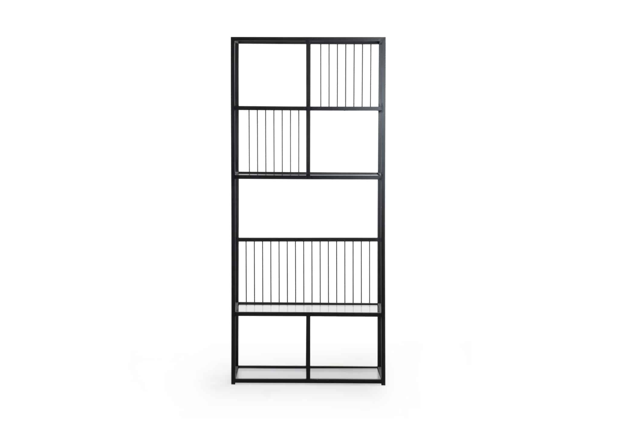 Detaliile verticale metalice adaugă profunzime vizuală, în timp ce structura aerisită permite evidențierea obiectelor decorative sau a cărților preferate. Este ideal pentru livinguri, birouri sau holuri moderne.