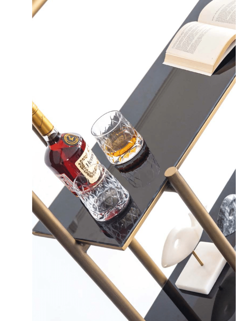 Adaugă un plus de rafinament și eleganță interiorului tău cu acest raft decorativ cu 5 polițe, ideal pentru living, birou sau hol. Designul său modern cu influențe glam se remarcă prin cadrul metalic finisat auriu mat și rafturile din sticlă neagră fumurie, oferind un contrast sofisticat și un look contemporan.