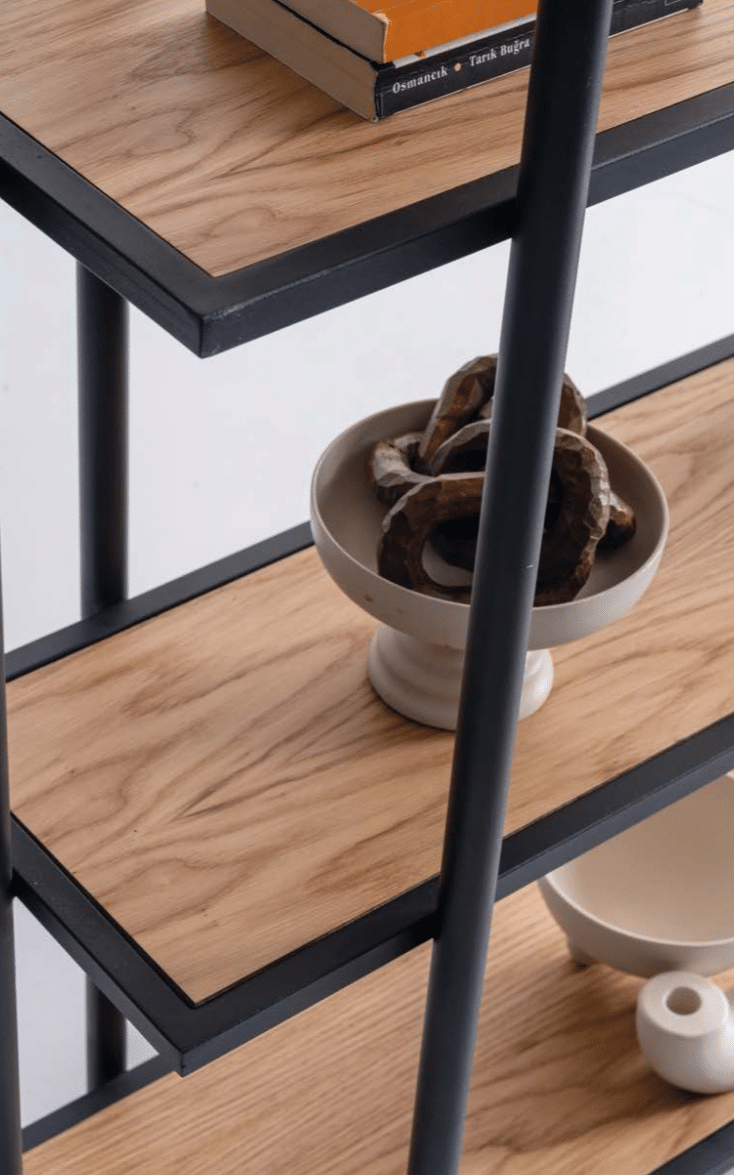 Îmbină estetica industrială cu eleganța materialelor naturale prin acest raft decorativ cu 5 polițe. Cadrul metalic negru oferă o structură solidă și un contrast rafinat față de rafturile din lemn cu finisaj cald, adăugând personalitate oricărui spațiu. Liniile curate și designul aerisit îl fac ideal pentru interioare moderne, scandinave sau loft-style.