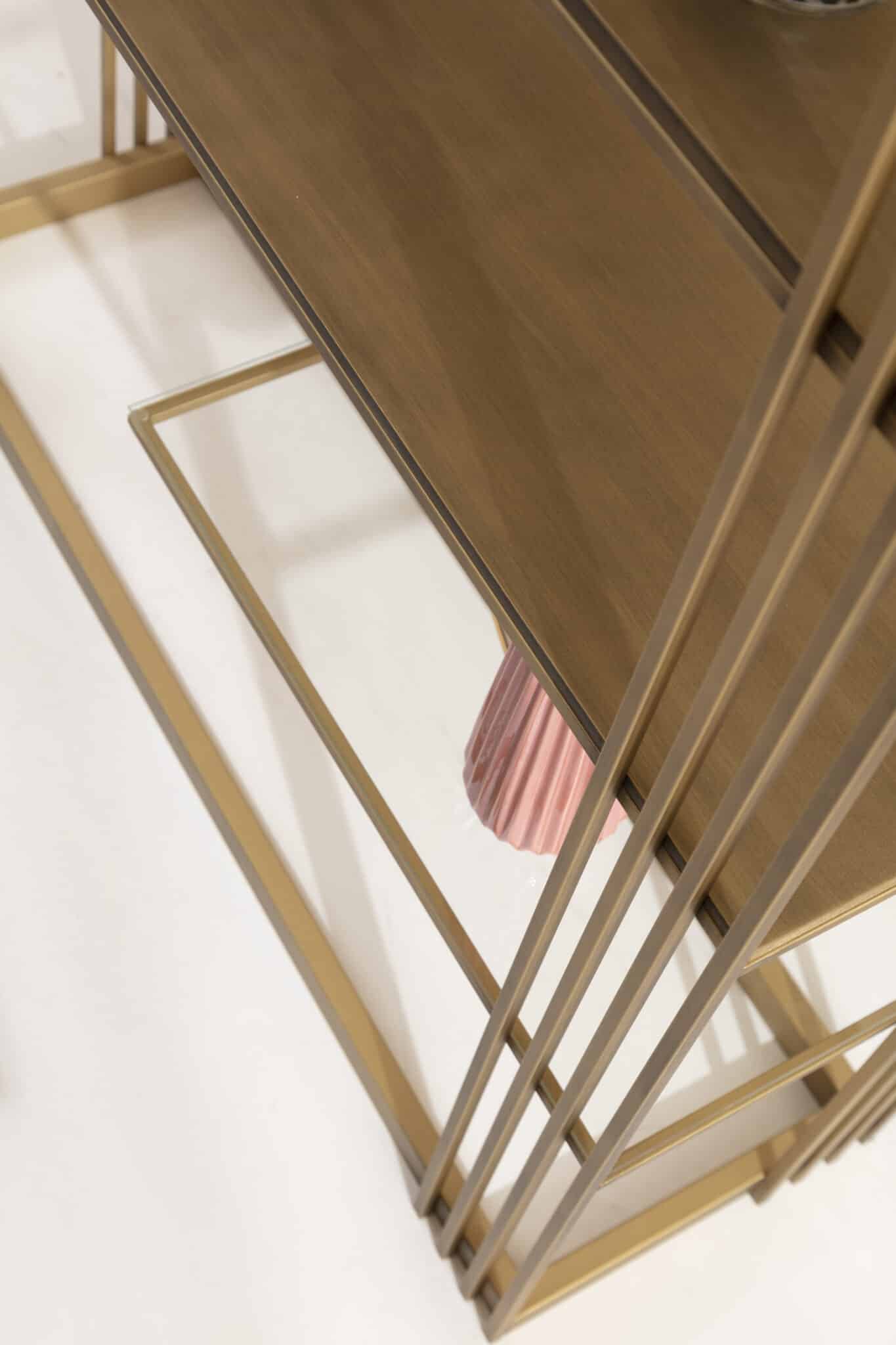 Transformă-ți spațiul într-un colț de rafinament modern cu acest raft decorativ cu design arhitectural. Cadrul metalic auriu cu linii verticale multiple creează un efect vizual unic, sofisticat și echilibrat. Rafturile din sticlă transparentă adaugă un aer elegant și permit pieselor decorative să se evidențieze natural.
