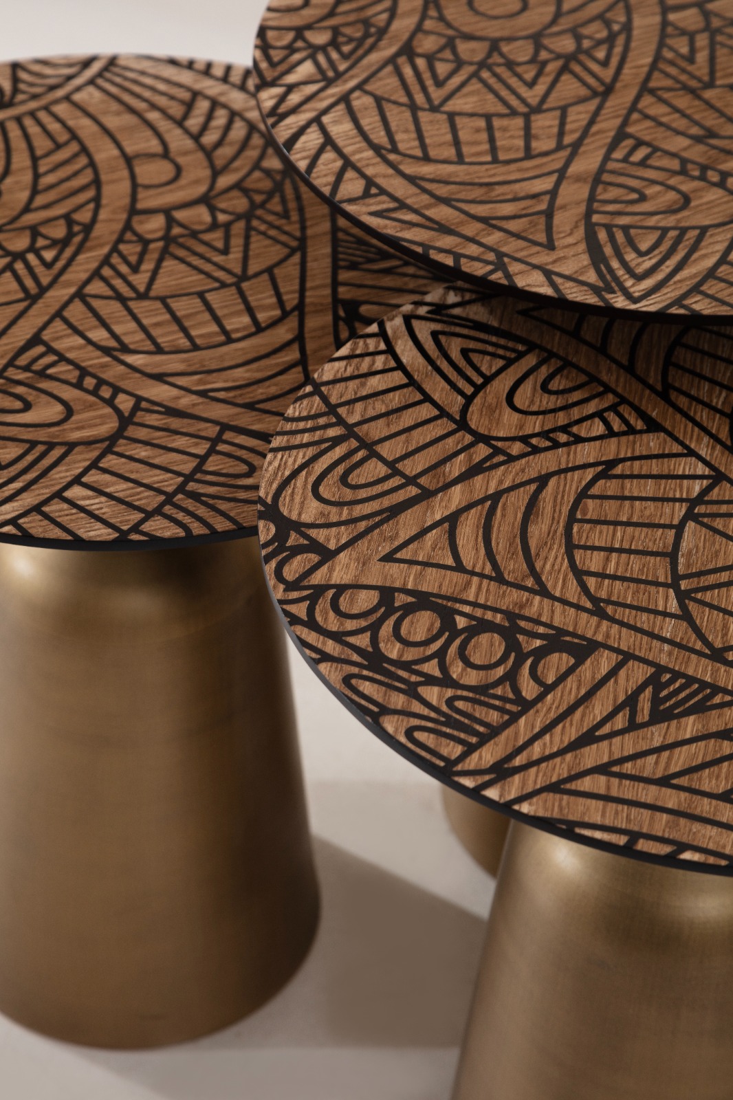Un set de măsuțe de cafea cu design modern și siluetă sculpturală, creat pentru interioare contemporane. Baza metalică cu finisaj auriu mat conferă eleganță și stabilitate, iar blaturile din MDF cu textură decorativă adaugă un accent distinctiv. Un ansamblu versatil, ideal pentru a completa zona de living cu stil și rafinament.