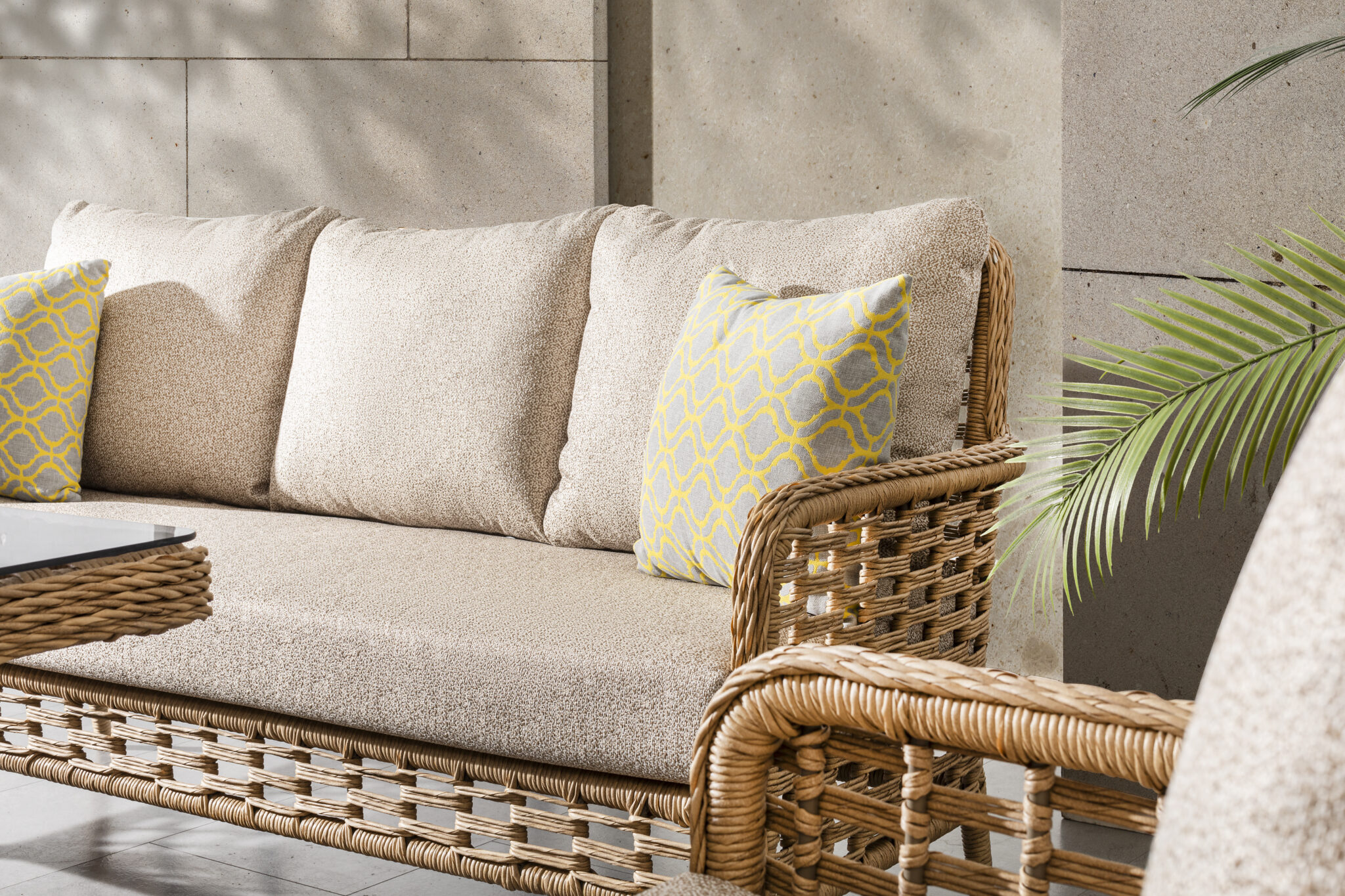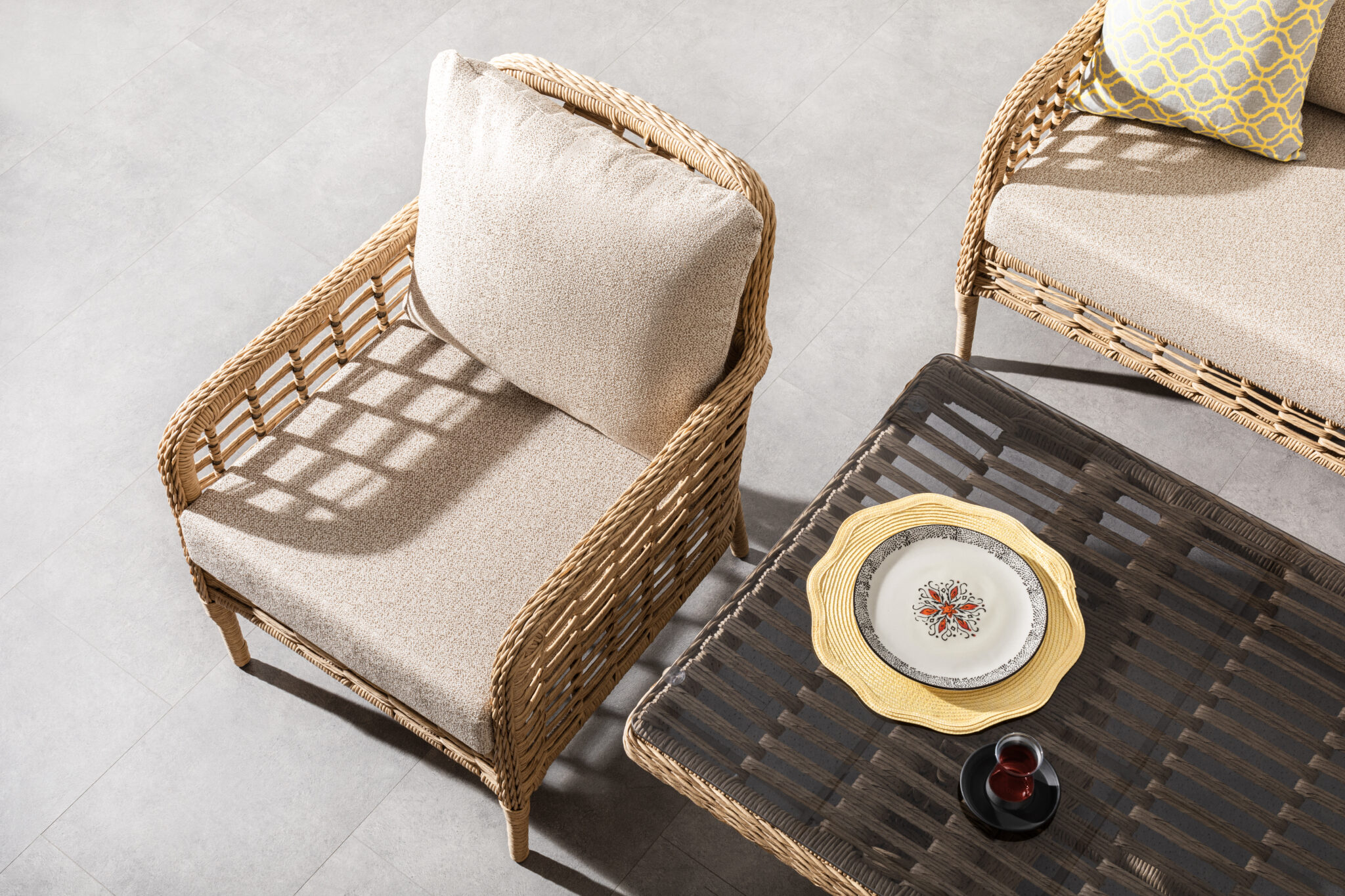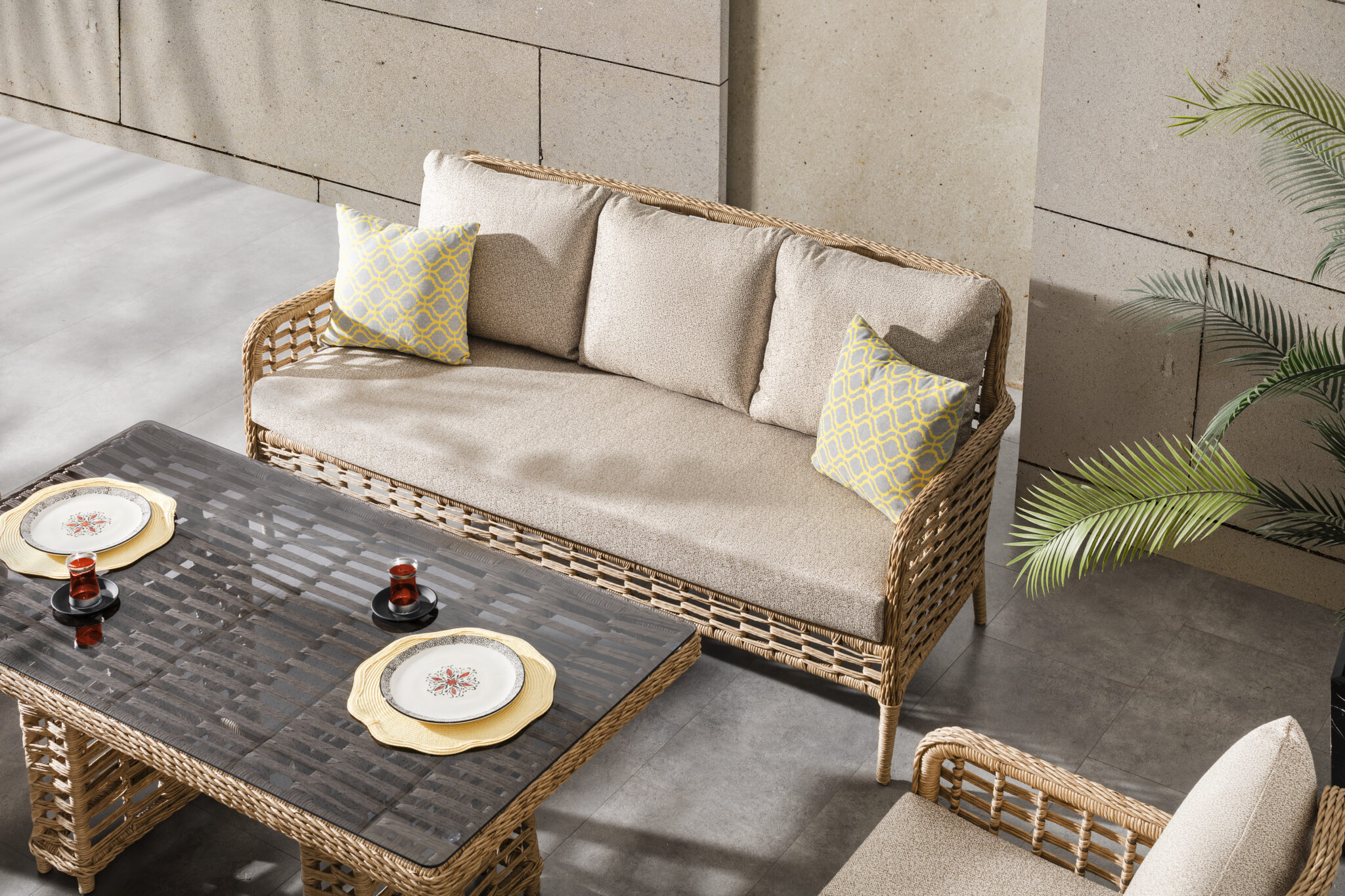 Setul de mobilier pentru terasă Truva impresionează prin designul său elegant și textura deosebită a ratanului împletit, fiind o alegere ideală pentru amenajarea unui spațiu relaxant în aer liber. Liniile curate și aspectul natural creează o atmosferă caldă și primitoare, potrivită pentru terase, grădini sau zonă de lounge.